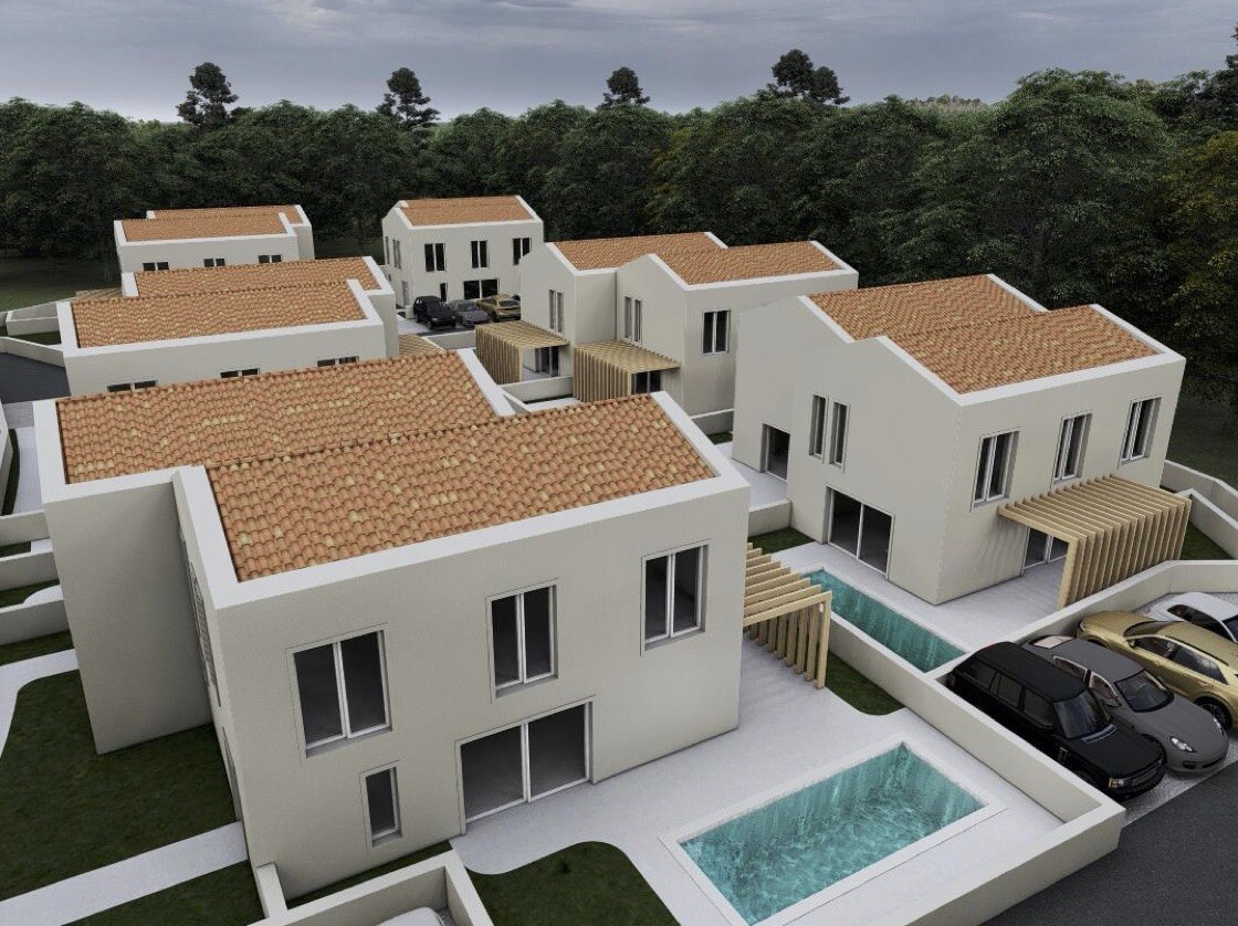 Kuće se sastoje od stepeništa, kuhinje, dnevnog boravka, blagavaone i WC u prizemlju, a na katu 3 spavaće sobe i dvije kupaone. Kući pripadaju dva vanjska parkirna mjesta i svaka ima svoj bazen cca 18m2.